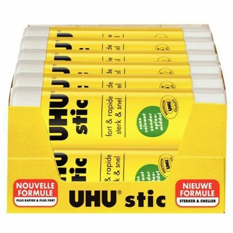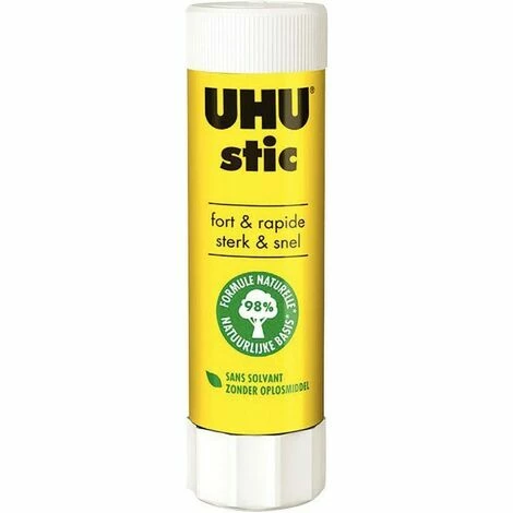 Bâton de colle blanche UHU stic, sans solvant, composée à 98% d’ingrédients naturels. Tube en plastique recyclé à 50%.