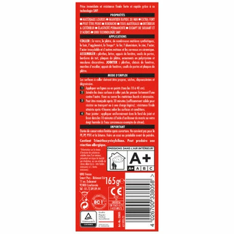 Lacolle Mastic Prise Immédiate Polymax UHU Blanc tube – 165 g – 33806 convient pour le collage, l’étanchéité et le bouchage, avec une prise initiale très forte et une grande résistance rapide. Le produit s’utilise sur la grande majorité des matériaux (verre, pierre, fer, aluminium, acier et tant d’autres) et également sur des nombreux supports, qu’ils soient lisses, poreux ou non poreux. Après les travaux, la colle est inodore, en plus de disposer d’une résistance aux moisissures, aux températures extrêmes, à l’eau, aux UV et aux intempéries.