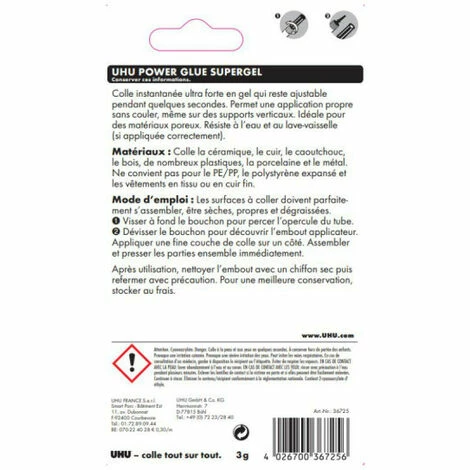 La colle UHU Power Glue 36725, est très pratique et s’applique facilement sur tout type de support. Très résistante, la colle reste élastique même après séchage. Sa formulation en gel lui confère une précision nette pour une application propre et sans coulure.