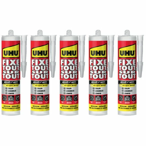 Un lot de 5 colles Fixe Tout Sur Tout Extrem Express Invisible UHU Cartouche – 300 g