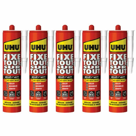 Un lot de 5 colles Fixe Tout Sur Tout Extrem Express UHU blanc cartouche 425g
