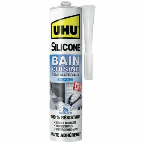 Lesilicone mastic UHU 38000 est spécialement conçu pour rendre étanches tous les joints de votre salle de bain et votre cuisine. L’application est très simple, sa couleur blanche offre un effet de propriété immédiat et une adhérence exceptionnelle. Très efficace pour les joints entre les murs carrelés et la baignoire, le plan de travail de votre cuisine, il convient à tout type de matériau tels que le verre, la céramique, carrelage par exemple. Ce silicone a l’avantage d’être résistant à l’eau ainsi qu’aux moisissures, pour une grande durabilité.