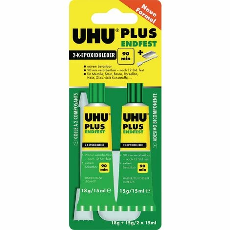 lösungsmittelfreier 2-Komponenten-Epoxidharzkleber für höchste Belastungen · Mischungsverhältnis Binder : Härter = Volumen 1:1 · Verarbeitungszeit (Topfzeit) ca. 90 Minuten · bei Raumtemperatur nach 12 Stunden fest · Klebung ist schlagfest und beständig gegen Alterung und Feuchtigkeitseinwirkung